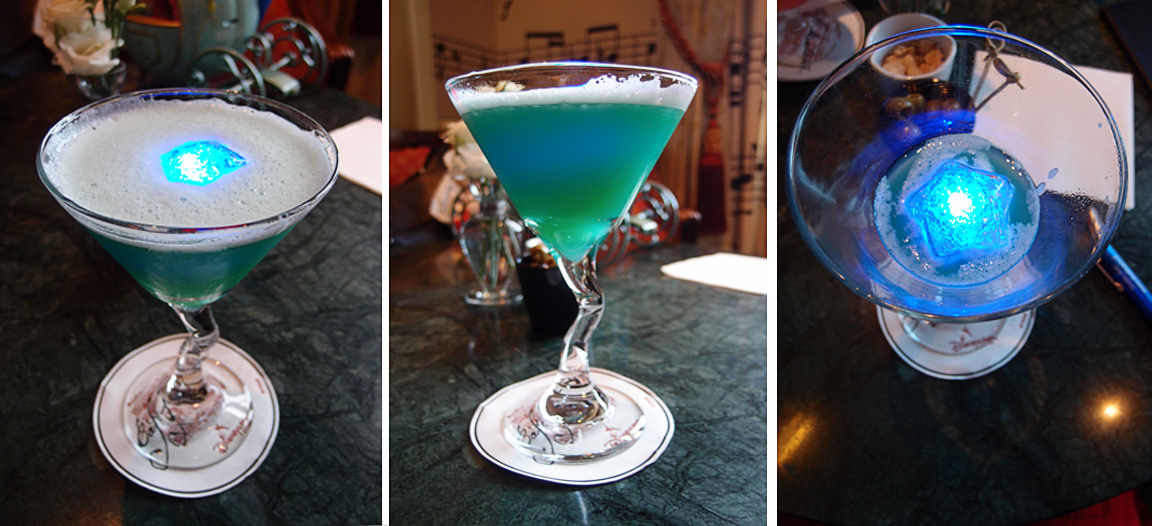 | Glow-tini saa nimensä drinkin mukana tulevasta hohtavasta jääpalasta (jonka saa pitää!) |